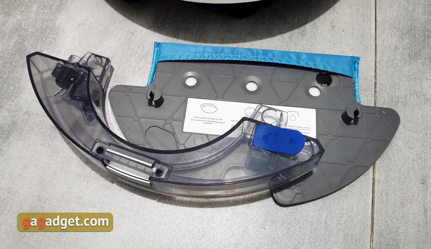 Бак для воды прозрачный, с фиксатором и двумя клапанами: для подачи воды во время уборки и для её заливания. На съёмной площадке есть липучки для фиксации микрофибры и два пластиковых фиксатора для крепления к баку.