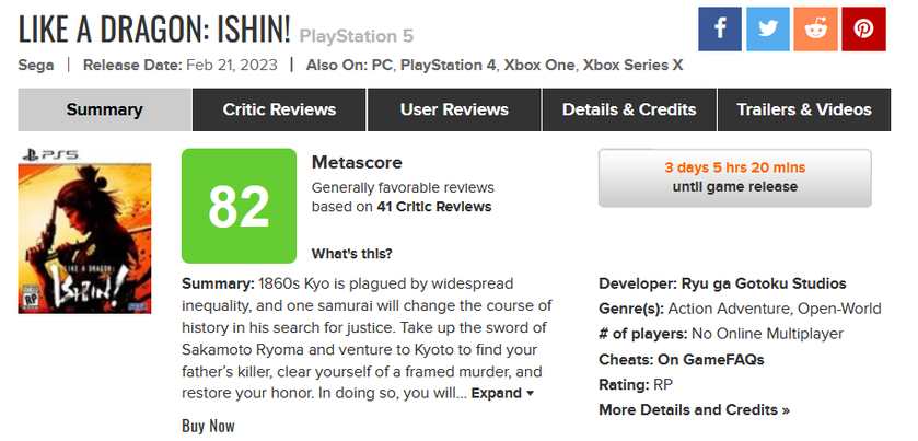 Like a Dragon: Ishin! received the first reviews from journalists. The game has 82 points out of 100 on Metacritic