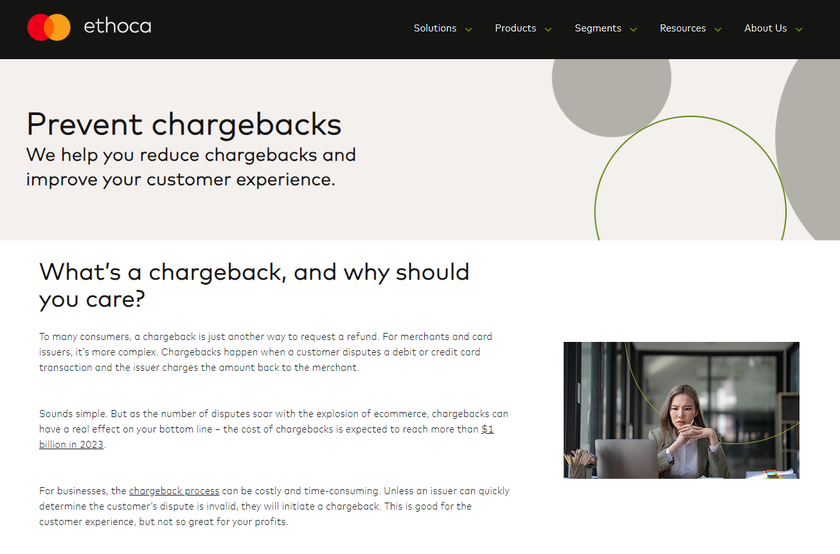 Ethoca facilitates collaboration between merchants and card issuers to resolve disputes quickly. Their "pre-chargeback" notifications let merchants refund transactions before a chargeback is filed.