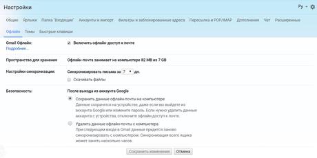 In the new Gmail you can use search, read letters and respond to them even without an Internet connection. Native offline mode does not require the installation of extensions and is included in the settings in the "Offline" section. The synchronization period is from 7 to 90 days, there is an option to automatically delete the data when you exit the account. Answers are placed in the Outbox folder and sent the first time they are connected to the network.