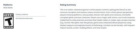 The board's website states that Kena: Bridge of Spirits on Xbox Series is recommended for those over the age of 13 ("T").