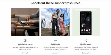 - Pixel phone: Links to common problems and Google Support articles, as well as resources such as Trade-in information, guides, Pixel simulator, device financing, Nest compatibility checker, Preferred Care, Pixel setup help, YouTube device information, and in-person appointments.