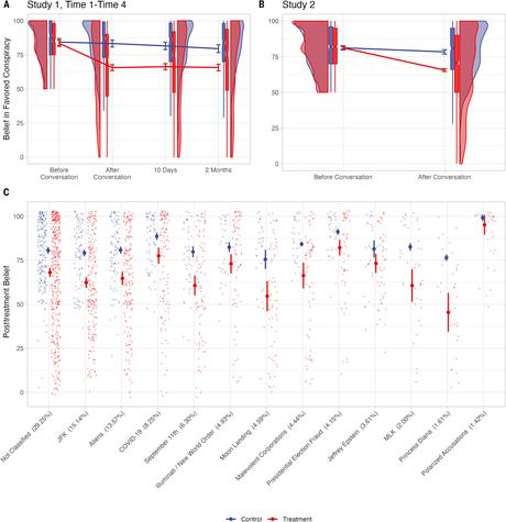 ( A and B ) Average belief in each participant's main conspiracy theory by condition (conversation, during which the AI tried to refute the conspiracy theory, in red; control, during which the AI discussed an irrelevant topic, in blue) and time point for Study 1 (A) and Study 2 (B). Pre-conversation beliefs were greater than 50 for all participants, as participants with a pre-conversation belief of less than 50 were excluded from the study. (C) Beliefs immediately after the AI conversation by condition and topic of the participant's main conspiracy theory. Error bars indicate 95% confidence intervals.