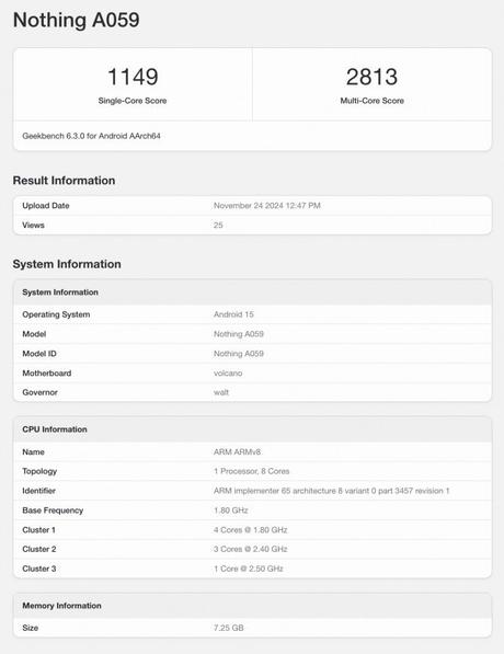 Judging by the specs listed, the device will feature a Snapdragon 7s Gen 3 chipset with a 2.5GHz main core, three performance cores at 2.4GHz and four efficient cores at 1.8GHz. In the Geekbench benchmark test, the smartphone scored 1,149 points in single-core mode and 2,813 points in multi-core mode.
