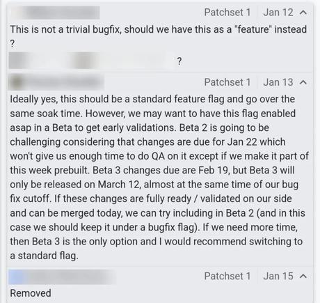 A comment that possibly reveals the release dates for the first three beta versions of Android 16. Illustration: Android Gerrit