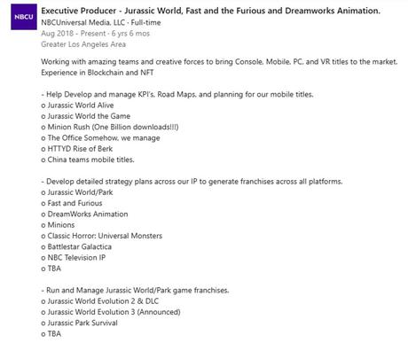 In the profile of the executive producer of game novelties Universal on Linkedln attentive users found a mention of some new project in the universe of Jurassic World.