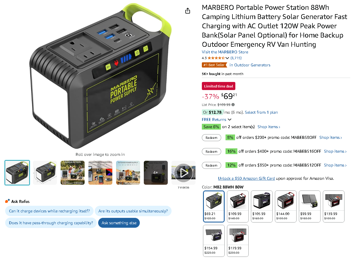 The MARBERO Portable Power Station is currently selling for just $69.21 compared to $109.99, -37%! An exceptional value for this versatile power solution.