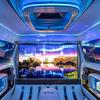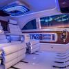 On either side of the cabin are aluminium-framed glass windows. The Dolby Atmos surround sound audio system features 42 speakers, including four elegantly designed in glass housings and placed on curved pillars extending from the side panels.