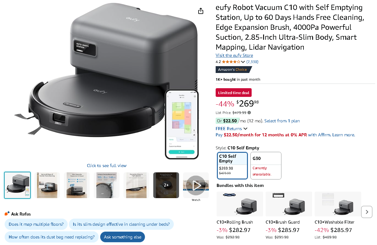 The advanced eufy Robot Vacuum C10 with Self-Empty Station is currently priced at $269.98, down from $479.99 – that's an impressive 44% discount! This substantial savings makes premium robotic cleaning technology accessible to everyone.