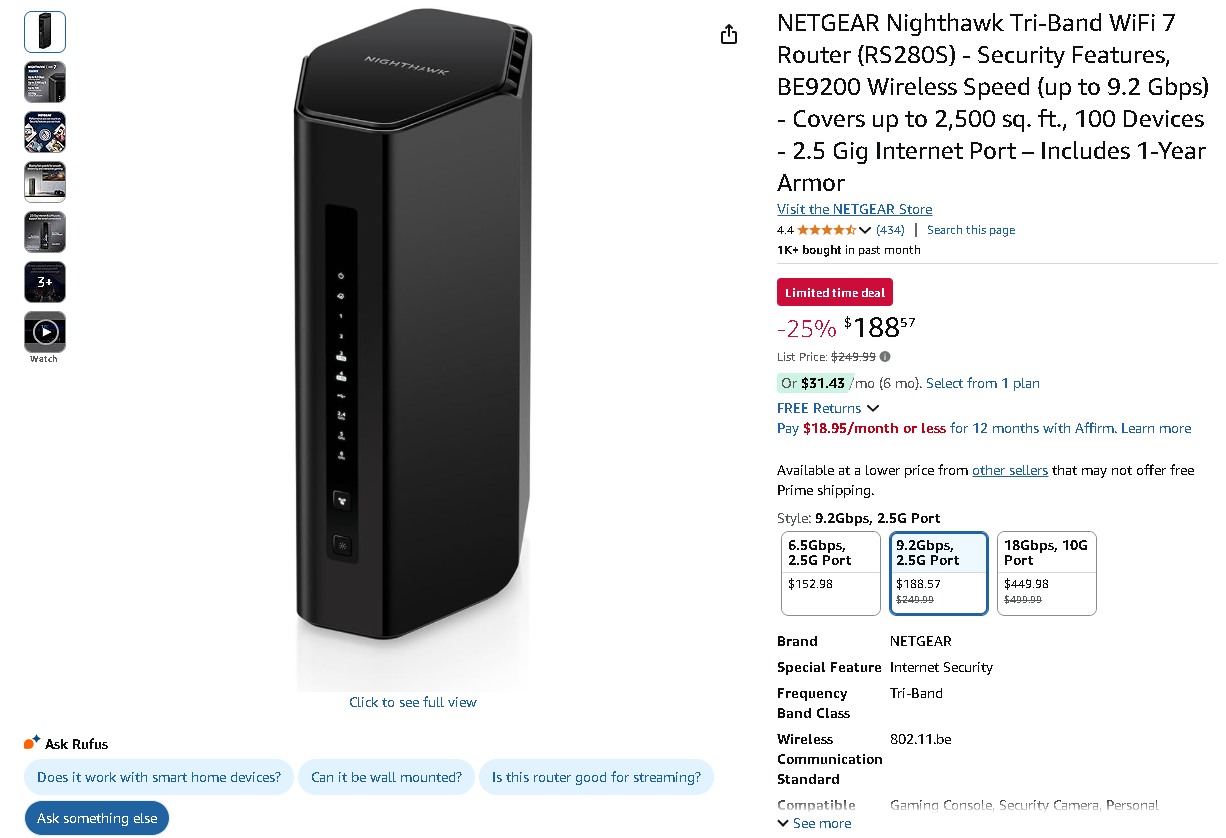 The powerful NETGEAR Nighthawk Tri-Band WiFi 7 Router is now available for $188.57, reduced from $249.99 – delivering a solid 25% discount! This pricing makes professional-grade WiFi 7 technology affordable for every home and office.