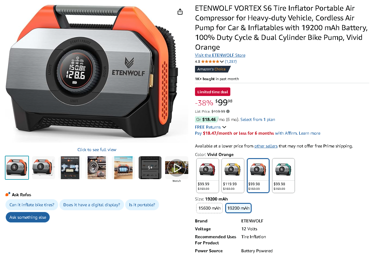 Get the ETENWOLF VORTEX S6 Tire Inflator at an Unbeatable Price on Amazon.com