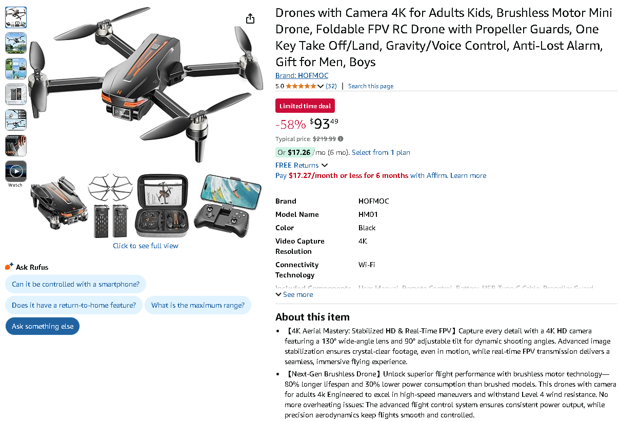 The feature-rich HOFMOC HM01 4K Camera Drone is now priced at just $93.49, dramatically reduced from $219.99 – an incredible 58% markdown! Professional aerial cinematography just became surprisingly affordable.
