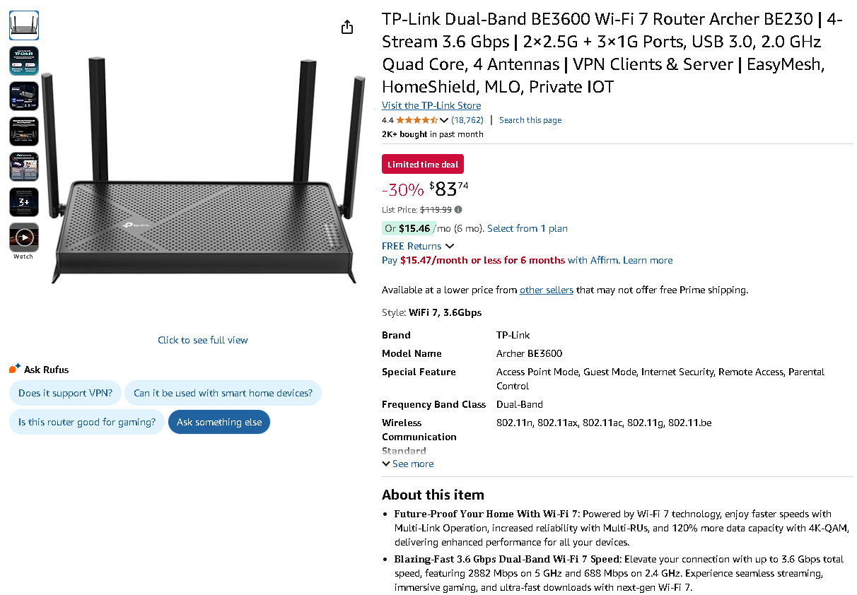 TP-Link BE3600 Wi-Fi 7 Router Archer BE230 Deal: $36.25 Off – 30% Amazon Discount!