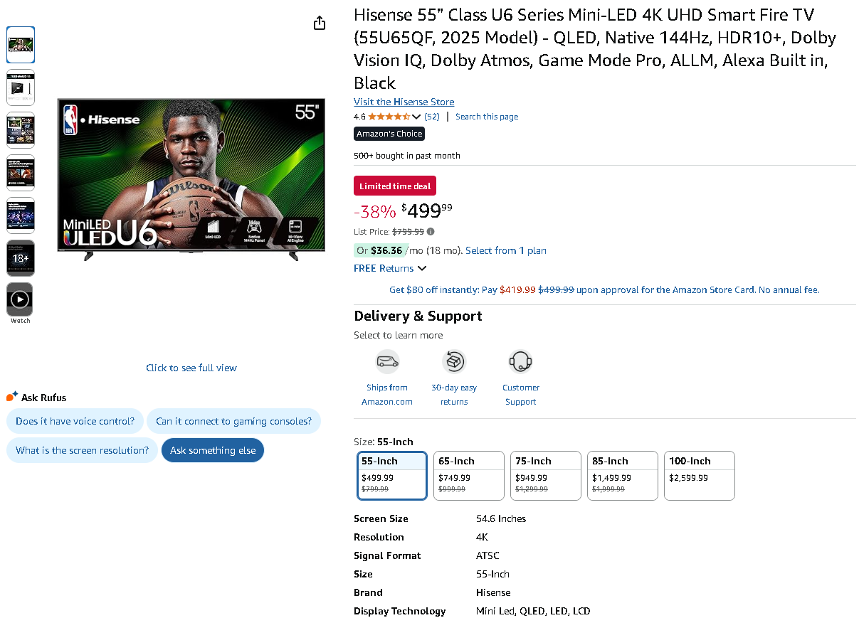Secure the Hisense U6 Series 55U65QF at an Incredible Value on Amazon.com