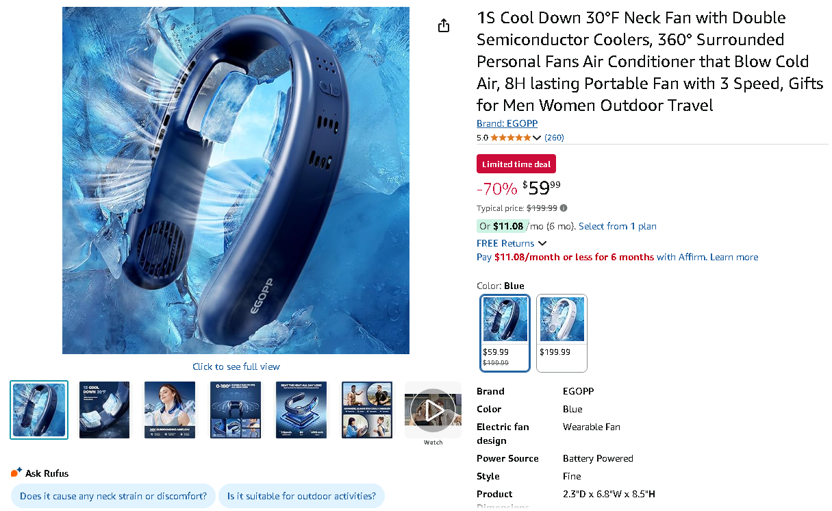 The revolutionary EGOPP 1S semiconductor neck fan is currently available for an incredible $59.99, drastically reduced from $199.99 – that's an astounding 70% discount!