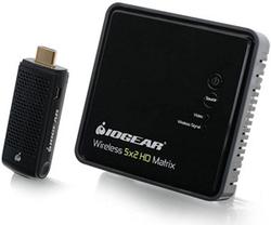 Wireless HDMI extenders are a low-cost alternative to professional presentation systems. They can't work with multiple signal sources at the same time, but are good enough for mirroring your laptop screen to a TV in 1080p resolution. OREI kit consists of two transmitter dongles and a box-shaped receiver with detachable antenna. Each dongle can be plugged into an HDMI port and uses USB for power. No need to install drivers or software applications. Despite the declared range of 50 feet, the manufacturer states it will not transmit through walls.