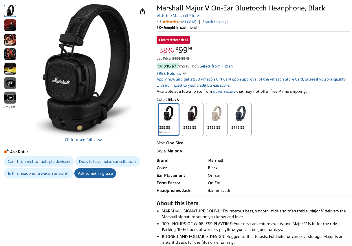 The Marshall Major V On-Ear Bluetooth Headphones are currently priced at $99.99, dramatically marked down from $159.99 – securing you an impressive savings of 38%! For authentic Marshall heritage audio with premium wireless features, this price drop is genuinely extraordinary.