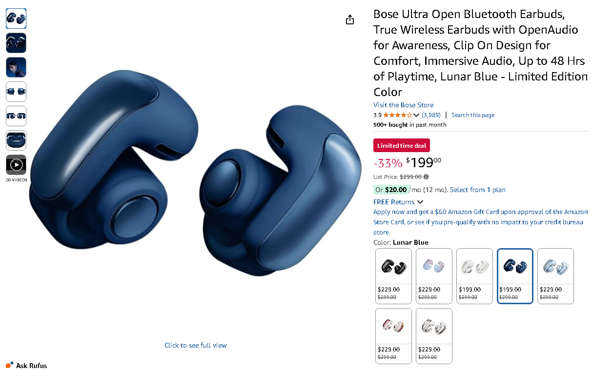 The Bose Ultra Open Bluetooth Earbuds are currently priced at $199.00, down from $299.00 - representing substantial $100 savings (33%)! This discount makes Bose's revolutionary open-ear technology accessible to a broader audience.