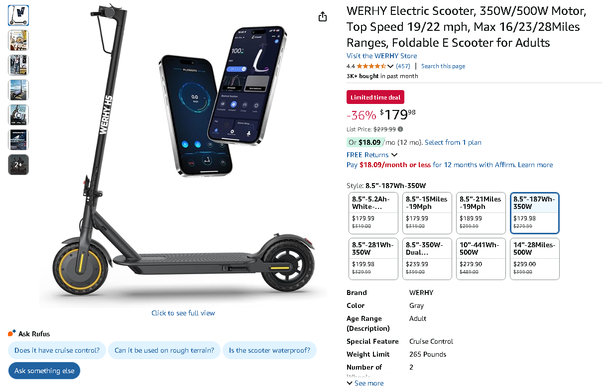 The WERHY H5 Electric Scooter is currently available for $179.98, down from the original $279.99 – that's an impressive 36% savings on this premium electric ride.