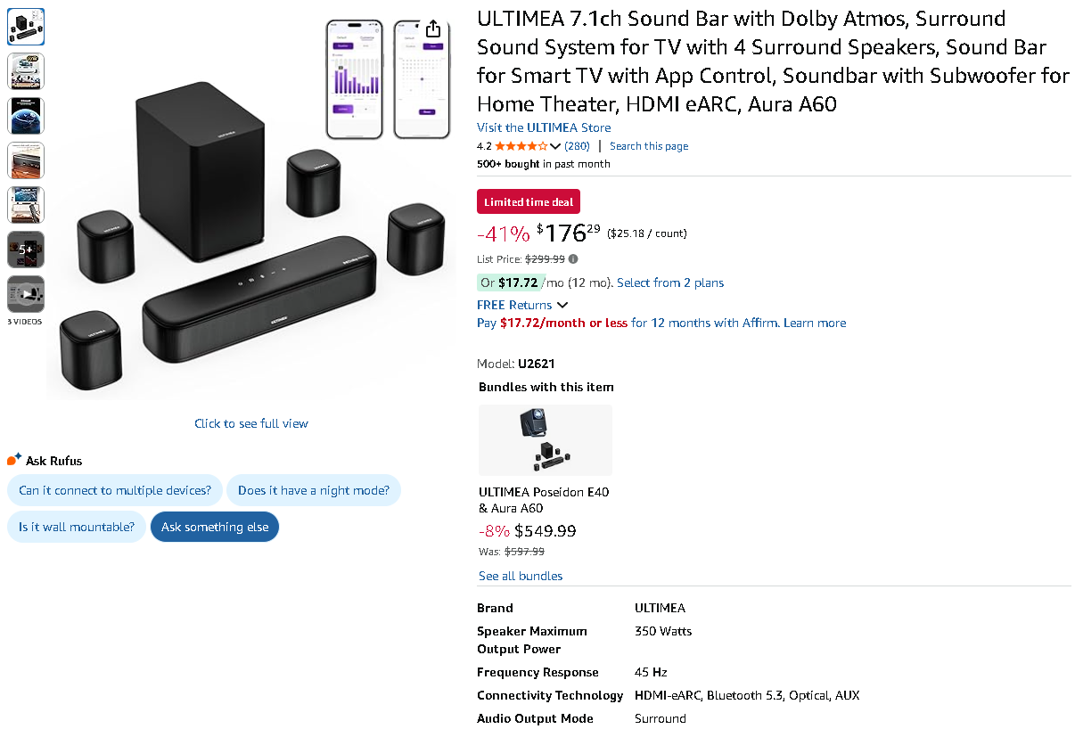 The impressive ULTIMEA 7.1ch Sound Bar system is now available for just $176.29 compared to $299.99 – that's an outstanding 41% price reduction! Premium home theater audio has never been this accessible.