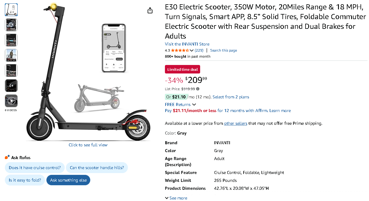 The INVANTI E30 is currently priced at $209.99 down from $319.99 – a substantial 34% discount on personal transportation that doesn't require insurance or registration.