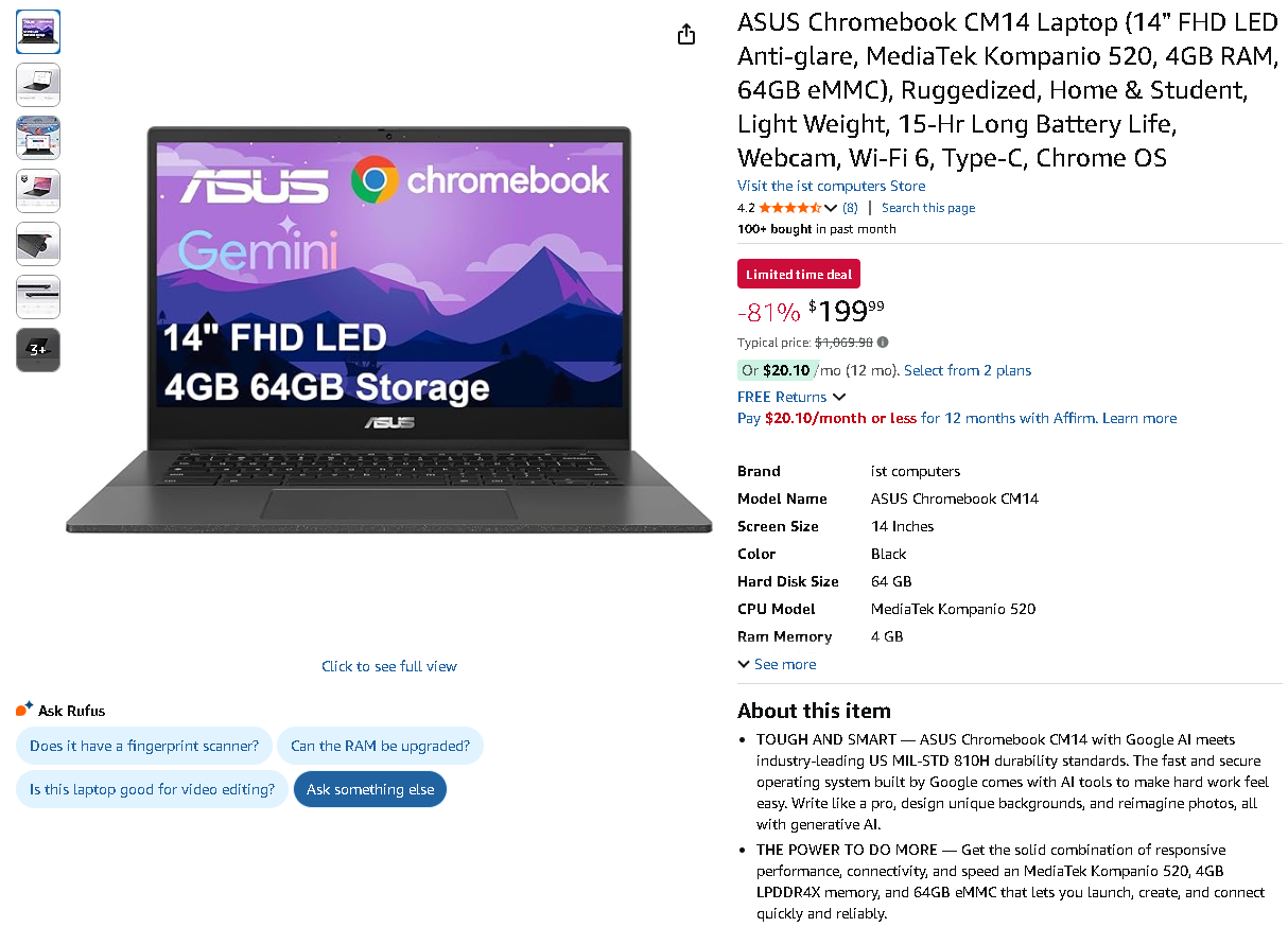 The ASUS Chromebook CM14 is currently priced at $199.99 down from its typical $1,069.98, representing an incredible 81% savings that's hard to believe but absolutely real.