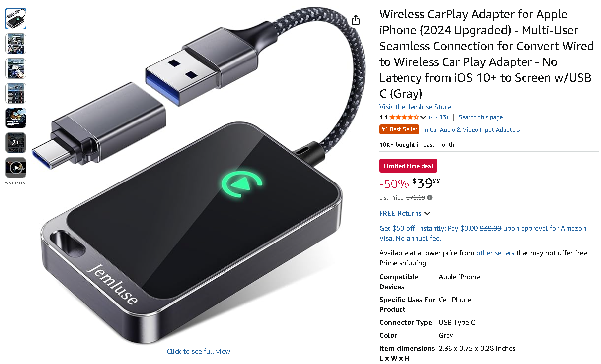 Grab the Jemluse Wireless CarPlay Adapter at Rock-Bottom Pricing on Amazon.com