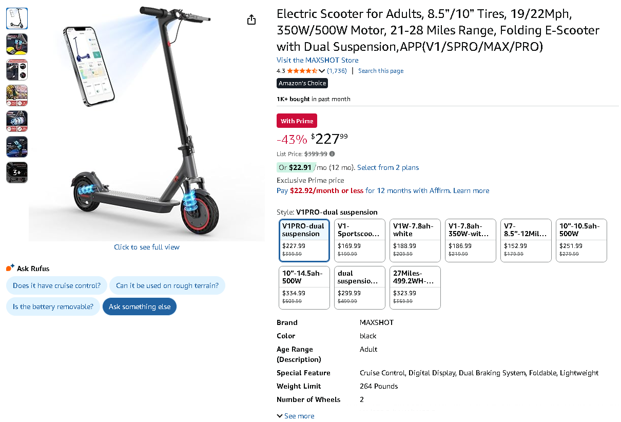 The feature-packed MAXSHOT V1 PRO Electric Scooter is currently available for just $227.99 compared to $399.99 – representing a substantial 43% discount!