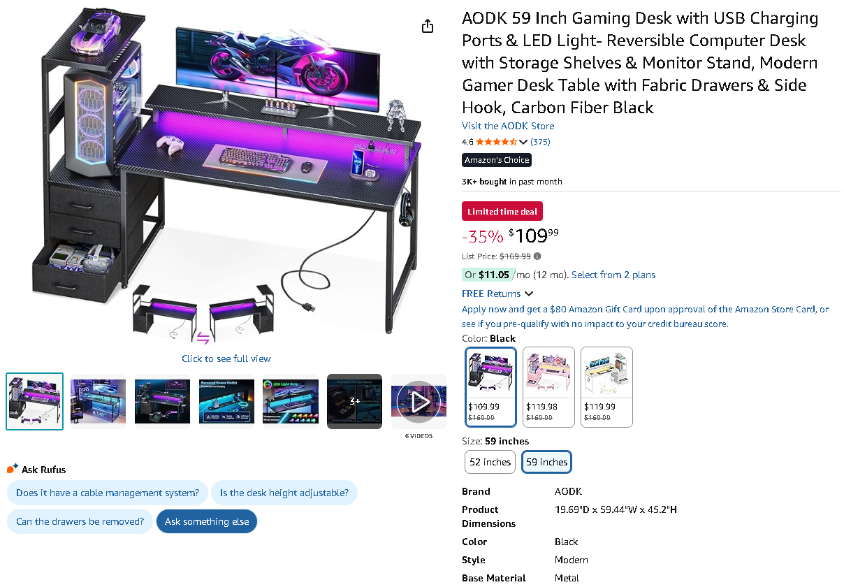 The feature-packed AODK 59 Inch Gaming Desk is currently offered at $109.99, reduced from $169.99 – representing exceptional value with 35% savings!