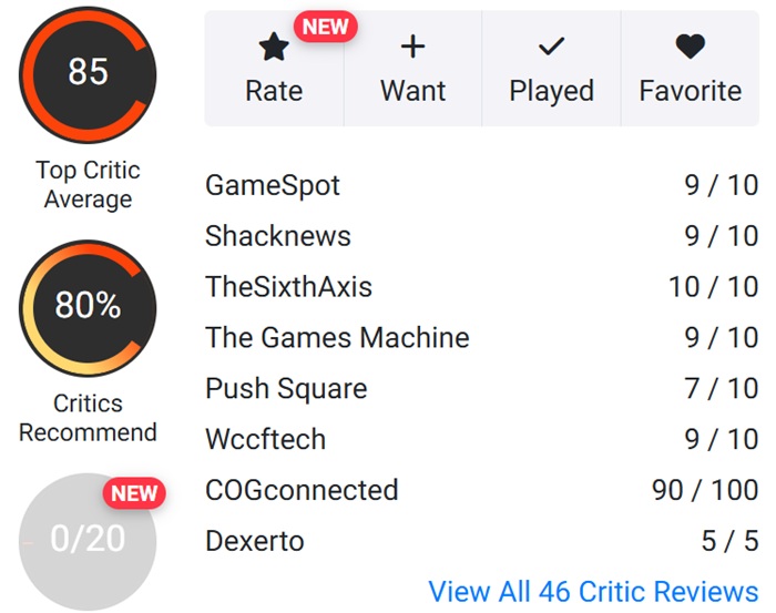 - OpenCritic - 85 points with 80% recommendation.