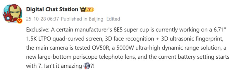 The smartphone is clearly aimed at competing with the upcoming "ultra"-flagships Xiaomi 17 Ultra, Oppo Find X9 Ultra and Vivo X300 Ultra. According to a Digital Chat Station insider, the device will get a top-of-the-line Snapdragon 8 Elite Gen 5 chip, a large 200MP periscopic sensor and a battery of around 7,000mAh.