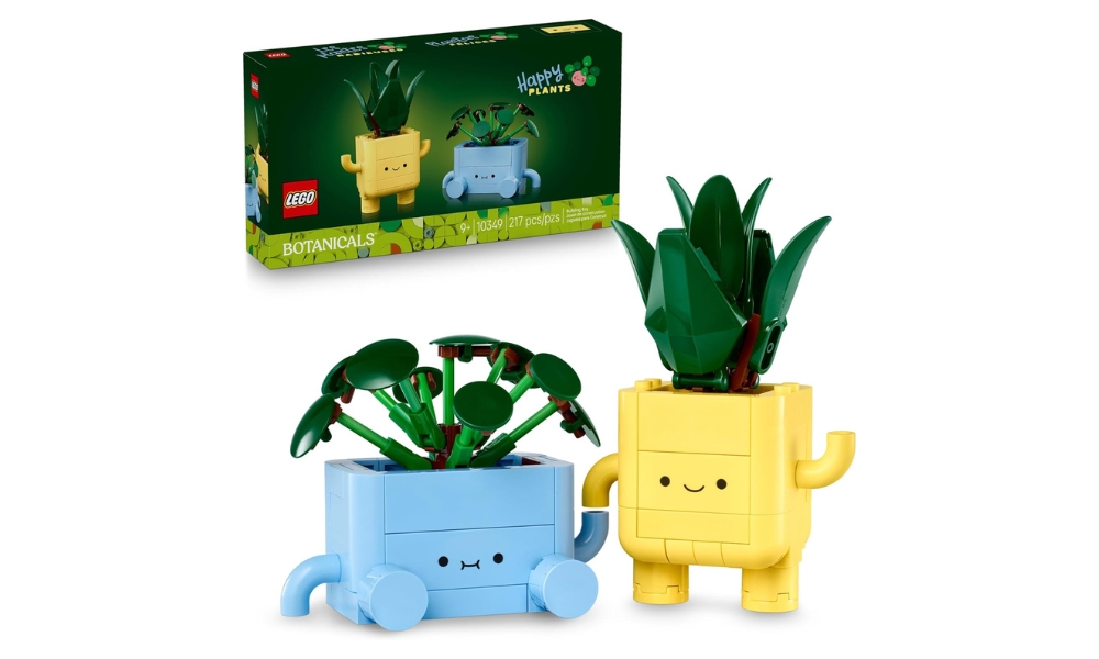 The LEGO Botanicals Happy Plants features 217 pieces building two plant pots with cartoon faces. The baby dracaena stands 4.5 inches tall while the baby pilea sits at 3 inches. Yellow and blue pots include poseable arms that can hold hands. Printed face plates avoid stickers. Lifting plants reveals tiny root systems underneath.