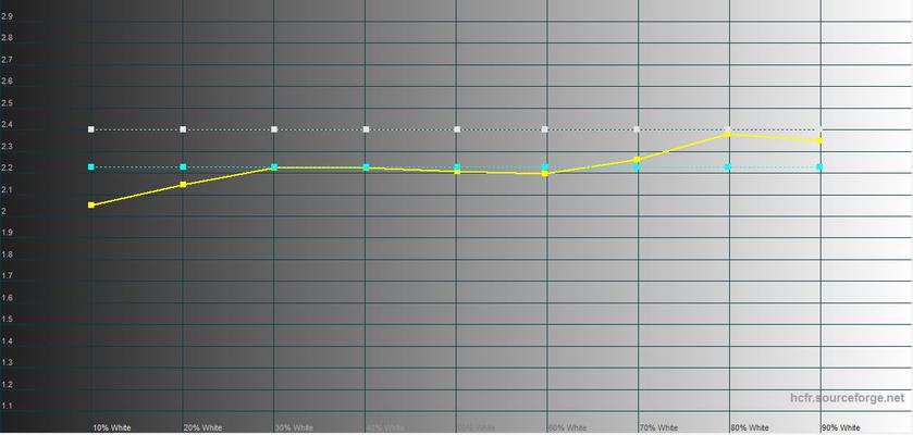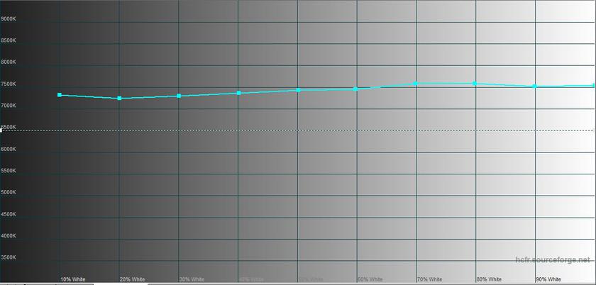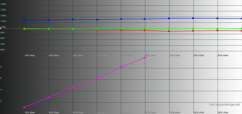 Measurements with a colourimeter showed that the maximum brightness in SDR mode is very close to the declared value: 387,707 cd/m² . The colour gamut of the screen is much wider than sRGB.