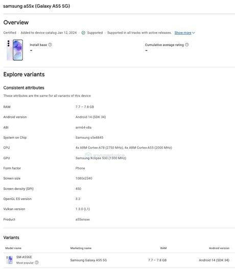 Galaxy A55 5G goes under the number SM-A556E. According to Google Play Console, the device will be powered by a proprietary Exynos processor with model number s5e8845. It contains four Cortex A78 cores, four Cortex A55 cores and an Xclipse 530 GPU. This number probably hides a new Exynos 1480 chip with AMD Xclipse GPU, which will be a significant upgrade over its predecessor Exynos 1380 with Mali GPU.