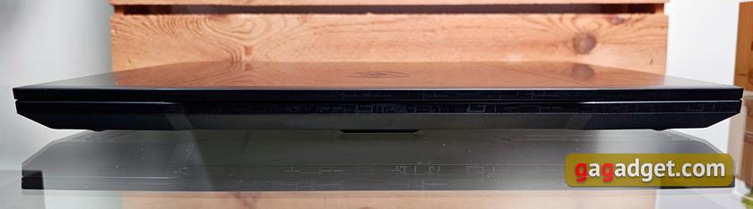 The front edge of the laptop has no functional elements. The back has two zones for blowing hot air out by the cooling system and hinges.