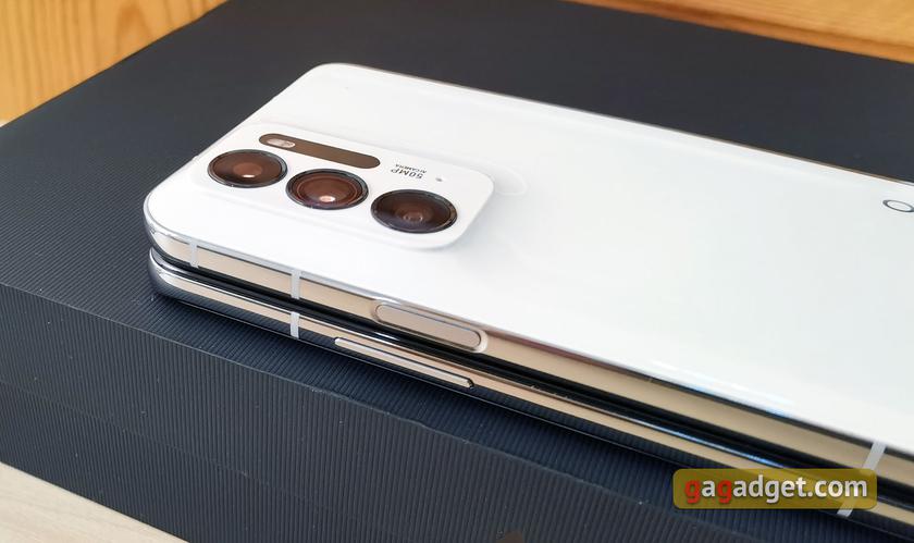 We managed to turn the white version of the smartphone in our hands. The back cover is made of glossy glass, but fingerprints are not visible on the white. The design of the camera is similar to the flagship OPPO Find X3 Pro. The entire lid is made from one piece of glass and smoothly "flows" into the camera unit. This solution looks unique and quite aesthetically pleasing.