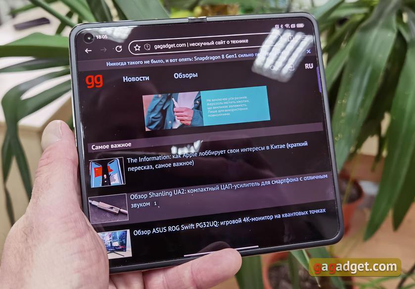 As mentioned above, when folded, OPPO Find N is a very compact smartphone that is convenient to use with one hand on the go. At the same time, the 5.49-inch screen diagonal allows you to comfortably use the entire screen area without having to intercept the smartphone. And the greater thickness adds points to the grip. That reduces accidental dropping when you answer a call or message on the go. The tablet version is great for surfing the web, reading, working with mail and documents: a lot of information is placed on the screen.