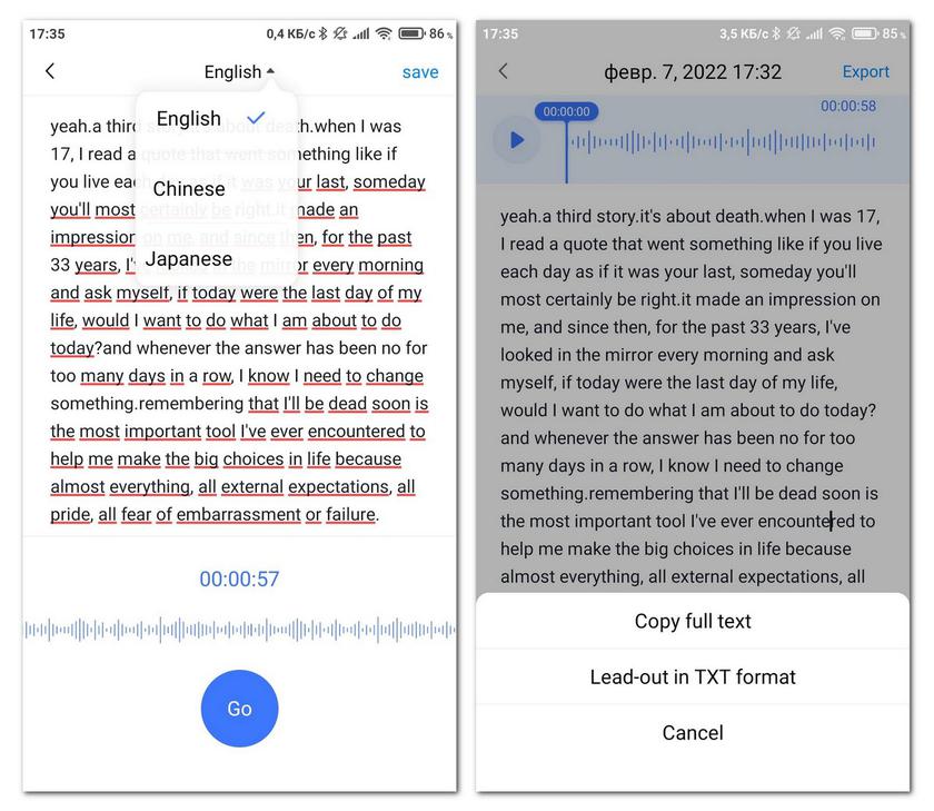 Deuxièmement, il existe une fonction d'enregistrement de notes vocales (notes vocales), un outil d'enregistrement pour la transcription vocale en temps réel, puis la sauvegarde. L'application stocke à la fois l'audio et le texte. Je note qu'à ce jour, cette fonction n'est implémentée que pour les langues anglaise, chinoise et japonaise. Il n'est pas clair s'il y aura un élargissement de la liste des langues, mais j'aimerais beaucoup. Vous pouvez juger de la qualité de la reconnaissance à partir de la capture d'écran. La source du test était un extrait du célèbre discours de Steve Jobs à l'Université de Stanford. Le signal audio peut être enregistré à partir du microphone du casque ou du microphone du smartphone. La raison pour laquelle le texte correct est immédiatement souligné d'une ligne ondulée rouge n'est pas claire, comme pour les erreurs. Nous attendons le russe et l'ukrainien dans les prochaines versions de l'application, car il est pratique d'écrire quelques réflexions lors de vos déplacements, puis de les utiliser comme texte.