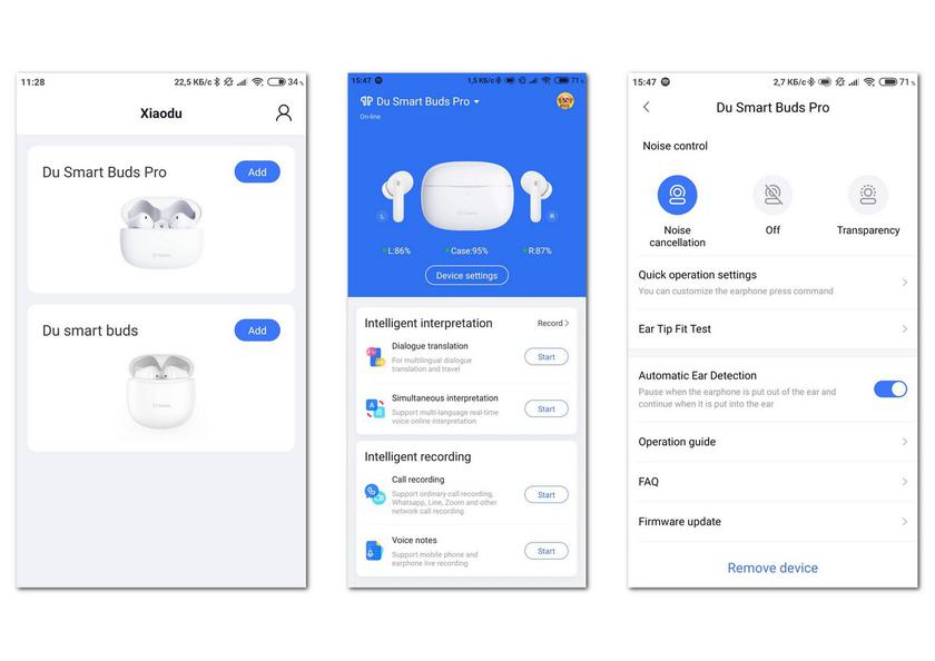 Bien sûr, Baidu Smart Buds Pro peut être utilisé sans l'application, mais c'est plus pratique avec, et il contient plusieurs "goodies" intéressants. L'application porte le même nom que la marque de l'équipement : Xiaodu. Il peut être téléchargé à partir des magasins d'applications Google ou Apple, il est lié aux écouteurs et, en fait, vous permet d'étendre les capacités de ce modèle, notamment en fournissant un service d'application supplémentaire.
