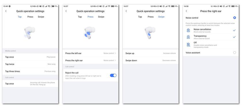 Passons maintenant à la section "Paramètres des opérations rapides". Cette section vous permet de voir ce qui se passe lorsque vous appuyez, pincez ou caressez les zones tactiles du casque, et en cas de serrage, personnalisez également l'option pour vous-même.