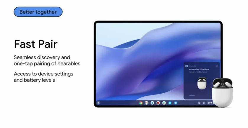 Tout d'abord, nous obtenons enfin Fast Pair pour Chrome OS. Fast Pair permet aux utilisateurs de combiner des accessoires compatibles avec une seule touche et de synchroniser les connexions entre les appareils. Cela signifie que vous pouvez passer facilement d'un appareil à un autre avec, par exemple, les Pixel Buds, d'une simple pression.