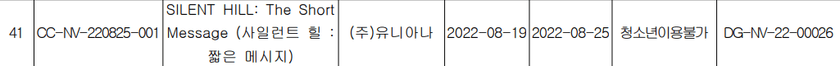 Selon Gametsu, le jeu non annoncé Silent Hill:The Short Message a été classé en Corée du Sud. Les plates-formes et la date de sortie ne sont pas précisées.