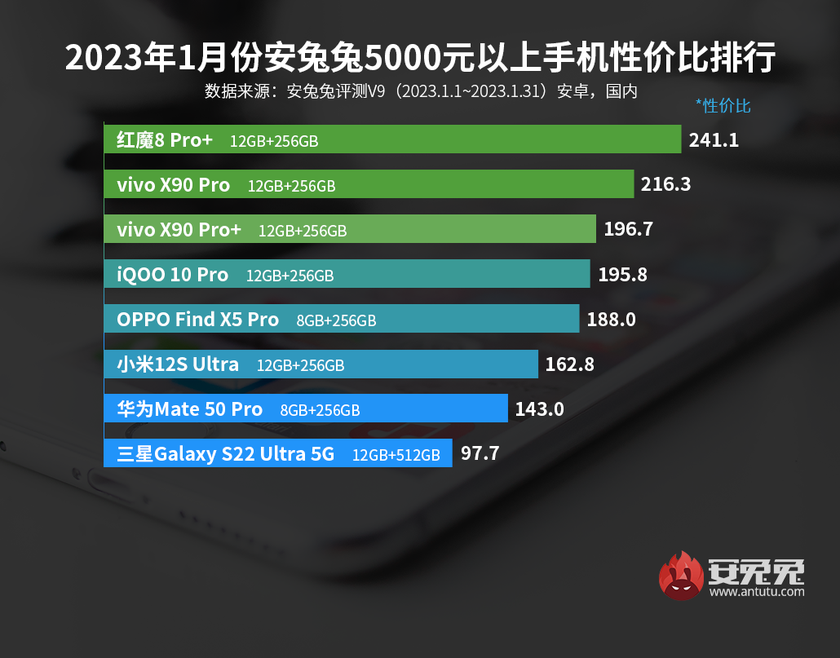 Dans le segment des 590-740 dollars, c'est le duo iQOO 11 / 11 Pro qui mène la danse, suivi par le duo Xiaomi 13 Pro / 12S Pro. Le classement des smartphones les plus chers est dominé par le modèle gaming nubia Red Magic 8 Pro+, qui s'en sort mieux que le vivo X90 Pro / Pro+.