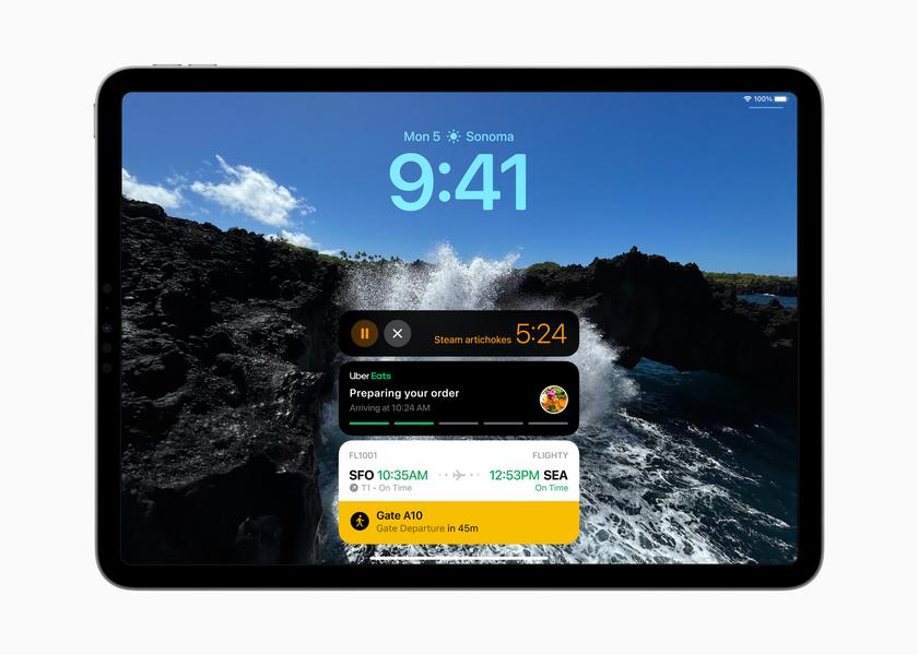 - Les utilisateurs peuvent désormais personnaliser l'écran de verrouillage avec un fond d'écran de la galerie, un cliché d'une archive personnelle, un ensemble dynamique de photos qui défilent tout au long de la journée, ou Live Photo pour un effet de ralenti transparent à chaque fois que l'iPad se réveille. Vous pouvez également obtenir des informations utiles à partir de l'écran de verrouillage : matchs sportifs, plans de voyage, commandes de livraison de repas, etc.