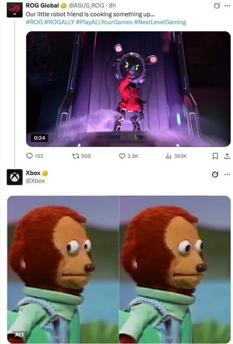 Le compte officiel Xbox a presque immédiatement réagi au teaser avec son propre mème. Ce n'est pas surprenant, puisque les initiés Jez Corden et Tom Warren ont rapporté il y a quelques semaines qu'ASUS et Microsoft travaillaient sur une console commune sous le titre de Project Kennan.