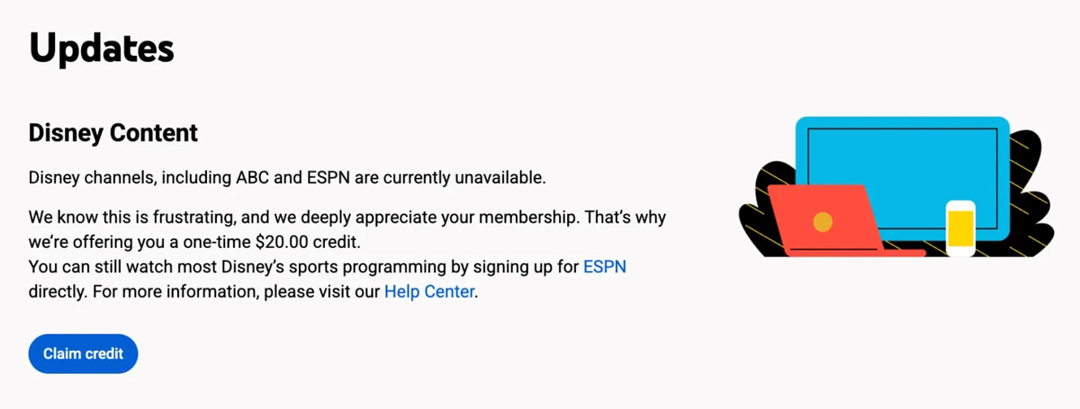 YouTube TV versera 20 $ de compensation aux abonnés en raison du blocage des chaînes Disney