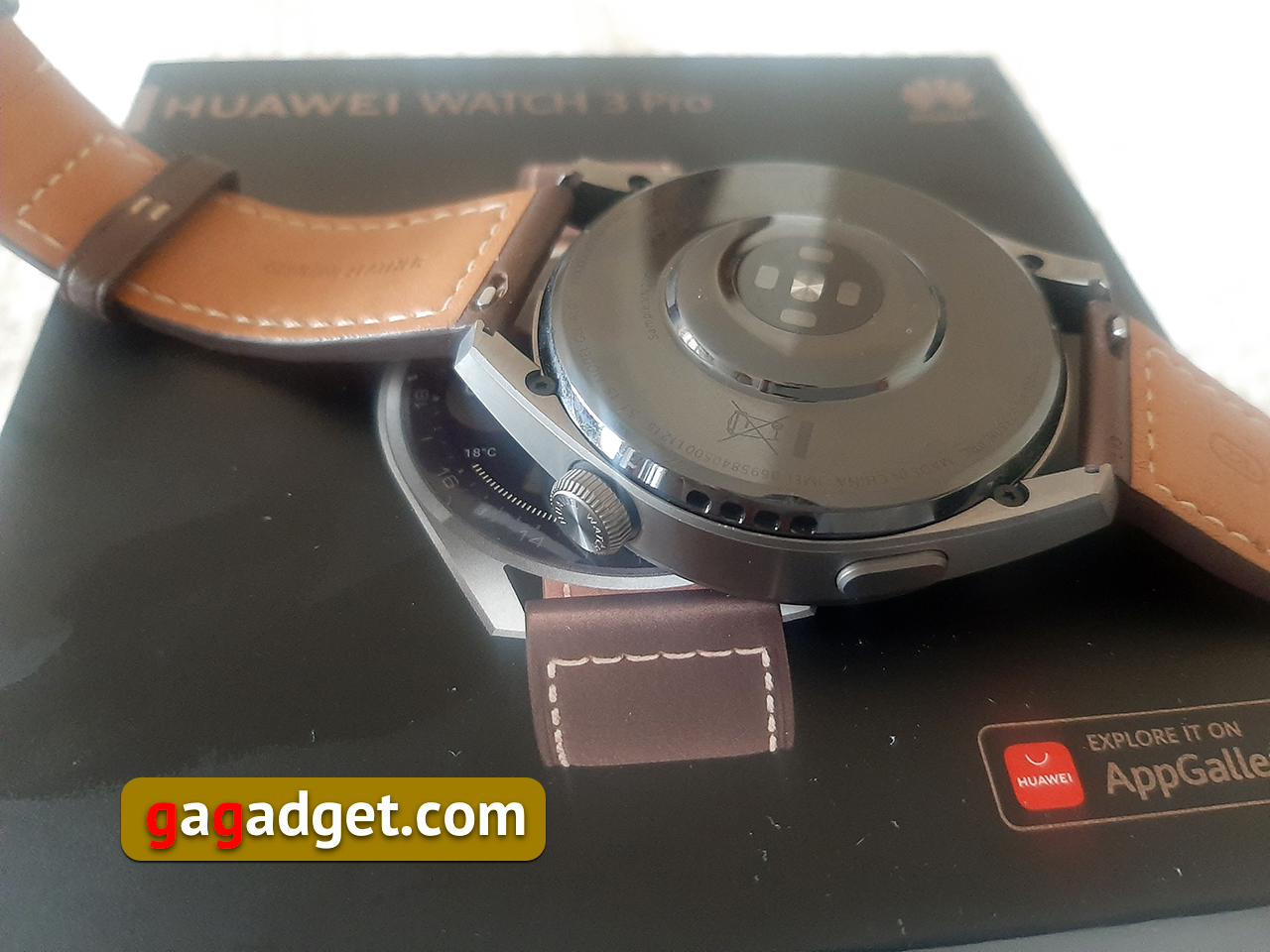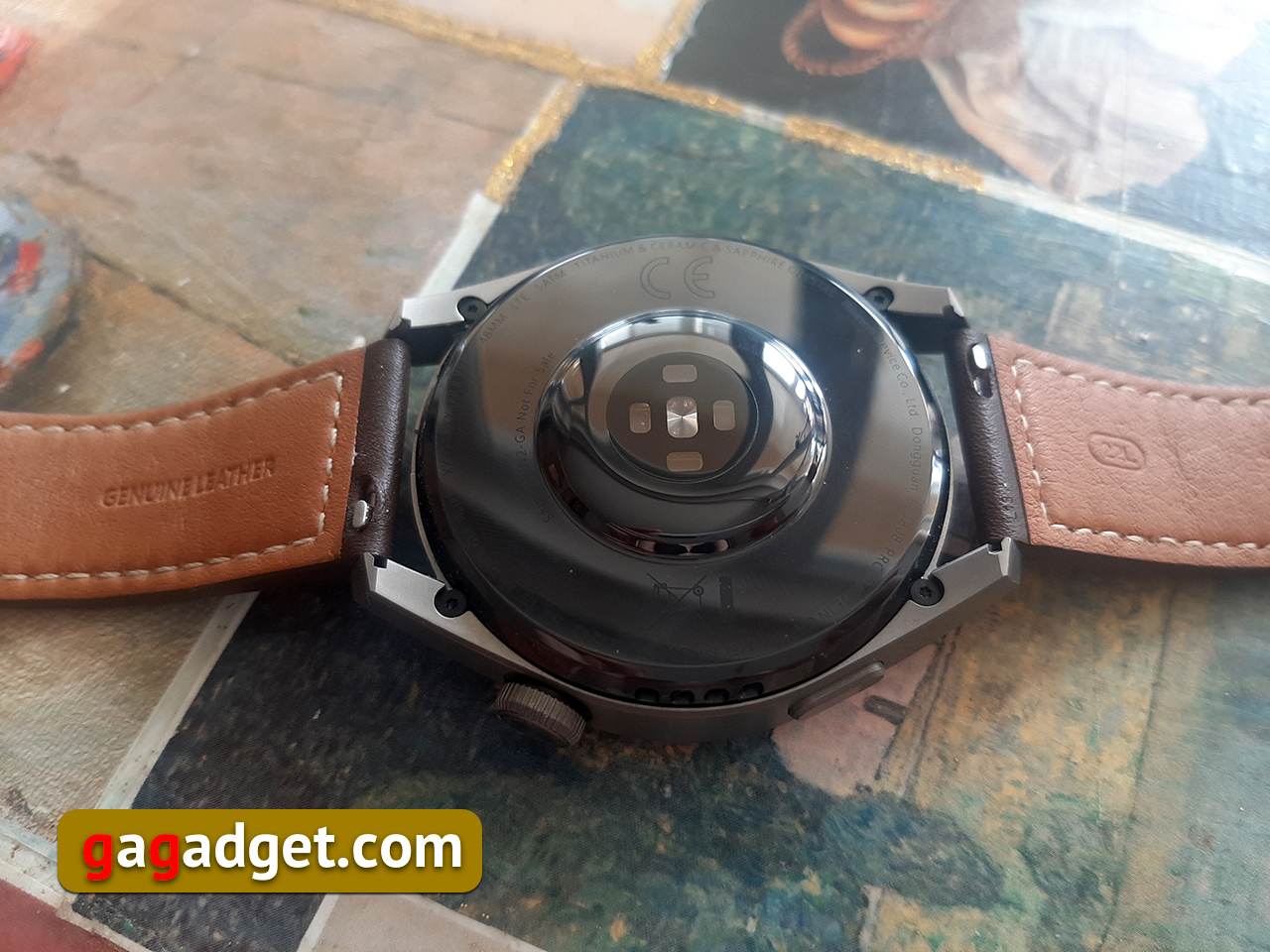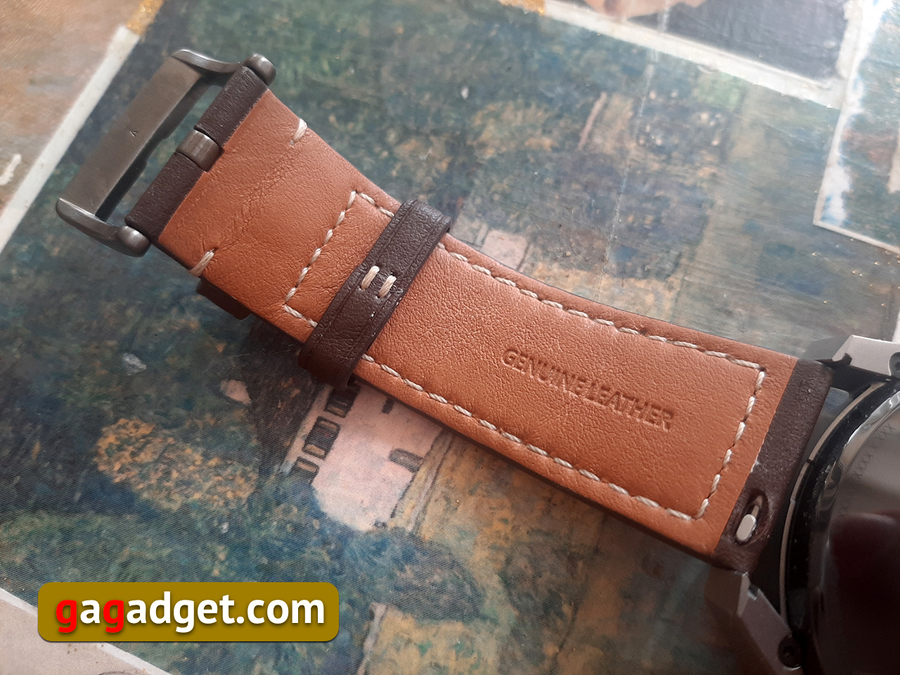 L'étui a également l'air bon et cher. C'est, d'ailleurs, du titane. Nous voulons ici nous rappeler tous ces nuages de smartwatches chinoises bon marché qui font le boîtier de matériaux inconnus de la même couleur en essayant de le faire passer pour du titane. Là, les oreilles "budget" ressortent malgré la couleur noble. Ici, vous pouvez voir tout de suite que la chose n'est pas bon marché.