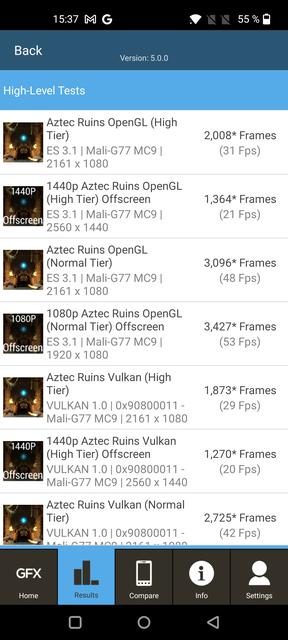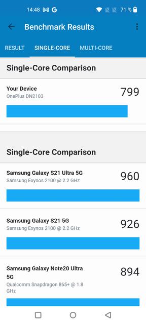 Si vous n'avez pas suivi l'actualité de ce modèle, vous allez être surpris. Au cœur de tout appareil hautes performances se trouve une plate-forme développée par Mediatek plutôt que Qualcomm. Cependant, ce n'est pas une contrefaçon ennuyeuse et bon marché, mais une puce MT6893 rapide de 6 nm, également connue sous le nom de Dimensity 1200 5G. Quatre des huit cœurs exécutent Cortex-A55 économiser la batterie avec 2 GHz, trois autres overclock à 2,6 et un - à 3 GHz (les quatre seconds sont plus rapides, c'est un Cortex-A78). La puce Mali-G77 MC9 gère les graphismes et le système est disponible avec 8 Go ou 12 Go de RAM. Le matériel s'est avéré très productif, montrant de bons résultats à la fois dans les tests synthétiques et dans les applications réelles. Selon Geekbench, les performances du Nord 2 sont comparables à celles du Samsung Galaxy S20+ (Exynos 990) ou du Xiaomi Mi 9T Pro (Snapdragon 855), voir captures d'écran des tests ci-dessous. La chauffe très modérée et la stabilité du processeur plaisent. Lors du trot, moins de 20% de la puissance maximale est consommée, et il le fait de manière prévisible et sans pointes aléatoires. Pour être honnête, je ne sais pas pourquoi quelqu'un aurait besoin de plus de puissance dans la vraie vie. Exceptionnellement, j'accepte les versions suivantes : Ponts destinés à dix ans d'utilisation, hardcore gaming et l'extraction de crypto-monnaie.