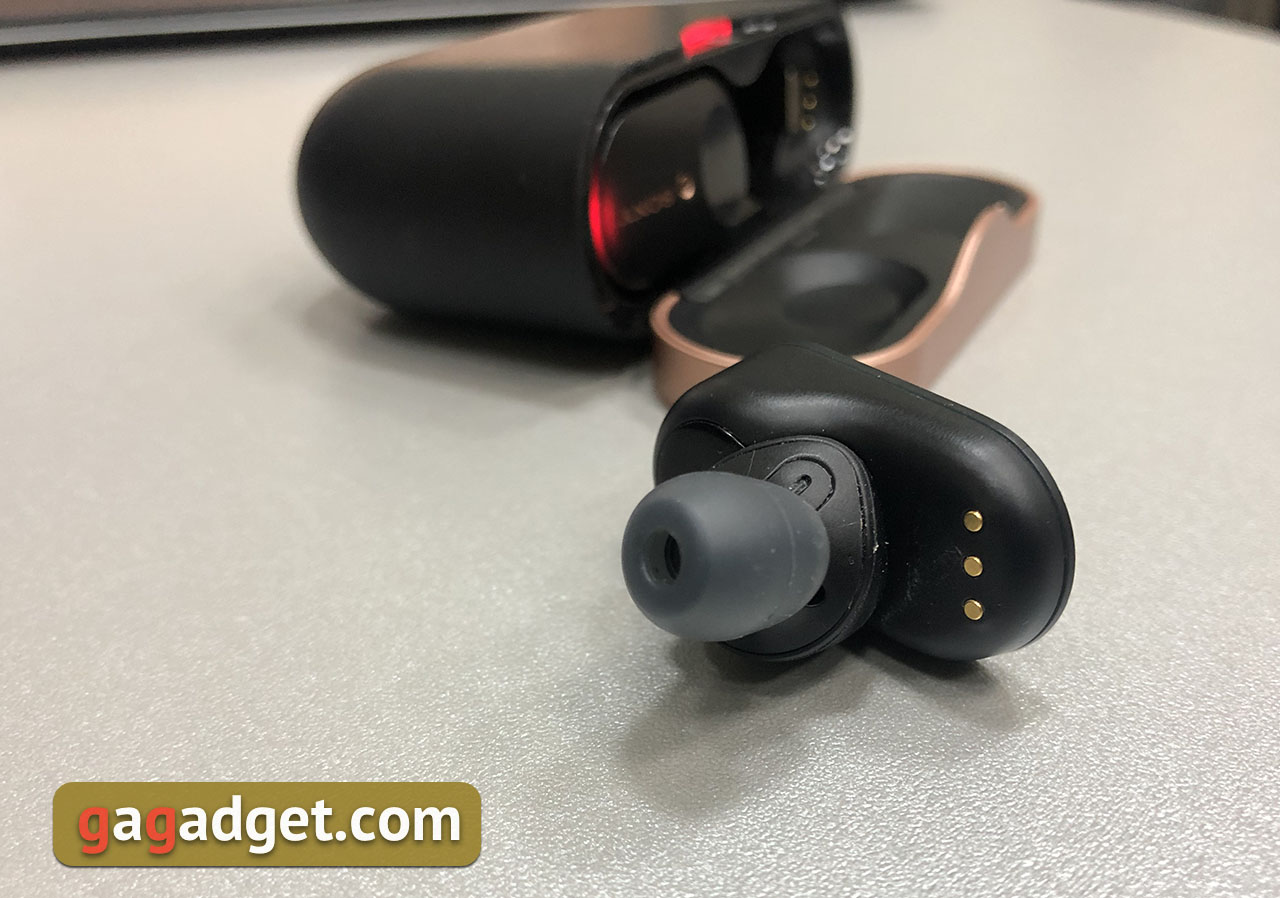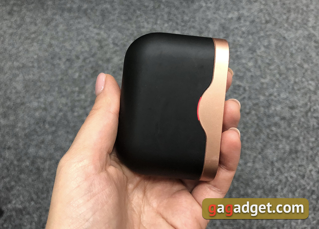 Comme les autres modèles de sa catégorie, ceux-ci ont reçu un étui de chargement dans le kit. Il est en plastique et se compose de deux parties. Le principal est en plastique noir, le couvercle est peint de la même couleur que le logo sur les écouteurs eux-mêmes. La peinture s'estompe rapidement, surtout si vous la transportez dans un sac avec des clés et qu'au bout de quelques semaines, elle n'a plus du tout l'air luxueuse. Et c'est gros aussi.