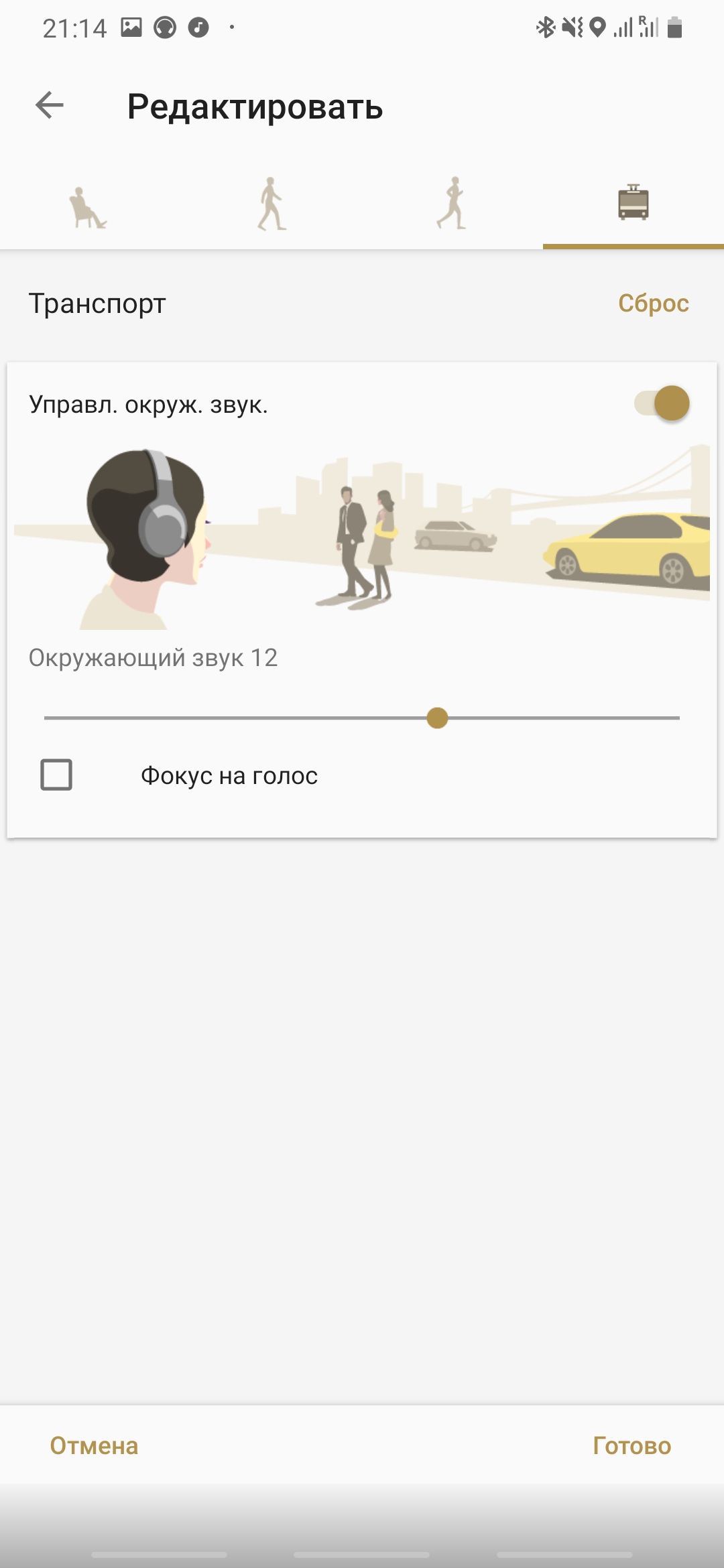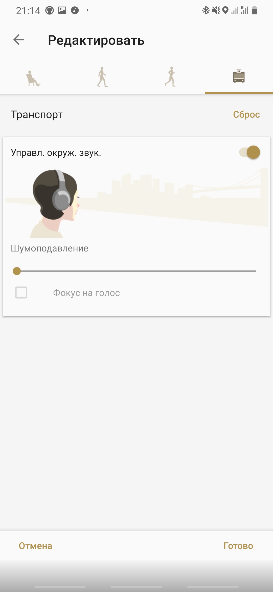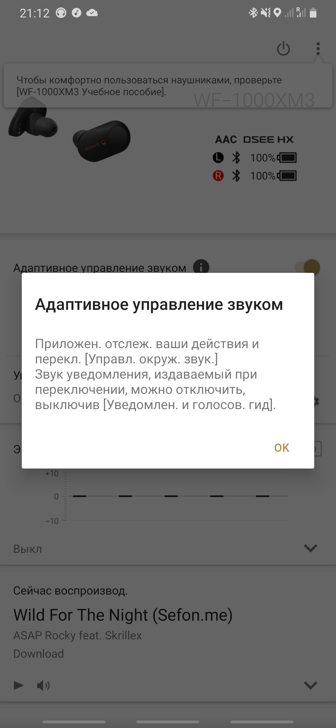 La réduction du bruit est vraiment perceptible, surtout après l'avoir éteint. Vous pouvez également activer le mode adaptatif dans l'application. Dans ce mode, les écouteurs écoutent leur environnement et modifient indépendamment les paramètres du système de suppression du bruit en fonction des sons de leur environnement. Au moment de la commutation, le son disparaît pendant une courte période. Au début, cela m'a semblé intéressant, puis le son a disparu toutes les 10-15 minutes (et cela s'est produit lors du changement de transport, de la marche, de la présence dans la pièce) a commencé à se fâcher et je l'ai simplement éteint.